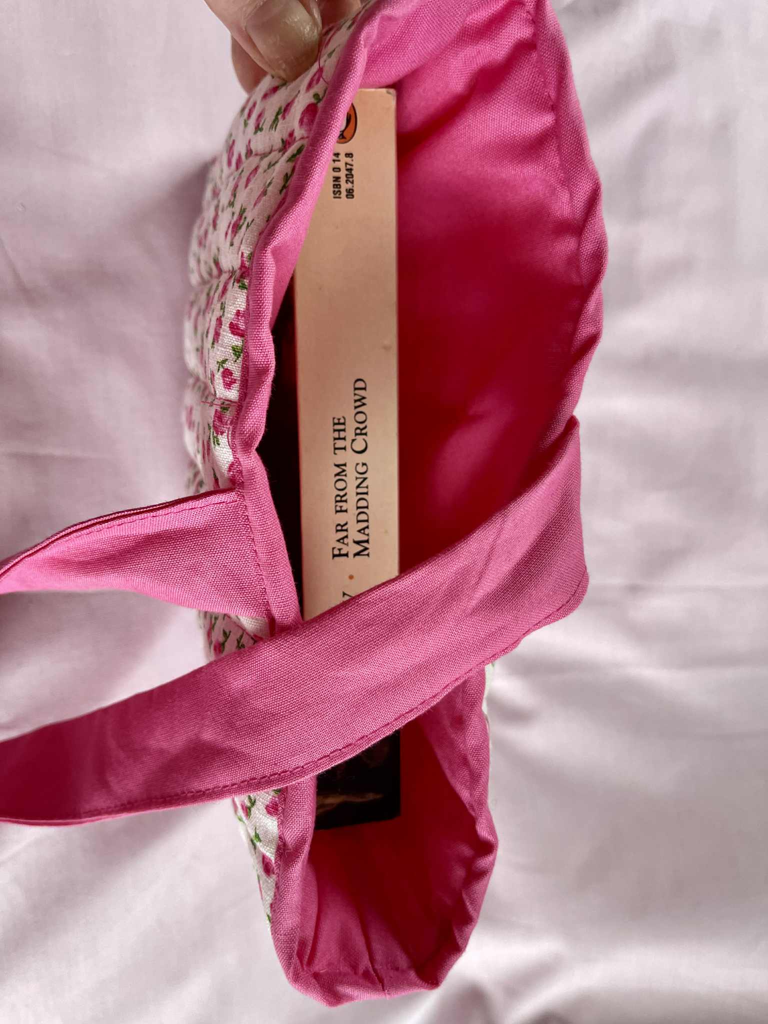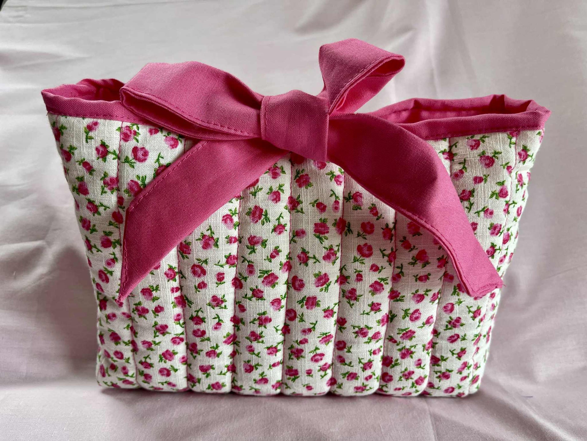 In cerise floral, with cerise lining, and closes with ties to create a bow.